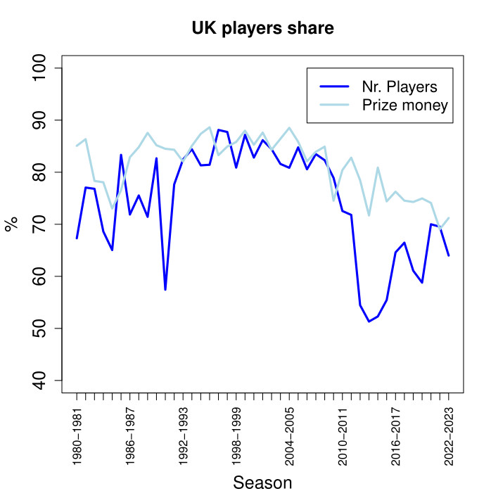 Tot slot, de grafiek hieronder geeft weer in hoeverre de ranglijsten gedomineerd worden door spelers uit het VK. De donkerblauwe lijn representeert het percentage van spelers op de ranglijst dat uit het VK komt. Dit percentage varieert tussen de 50% en 90%. De lichtblauwe lijn representeert het percentage van het totale prijzengeld dat door spelers uit het VK is verdiend. Dit percentage varieert tussen de 70% en 90%.