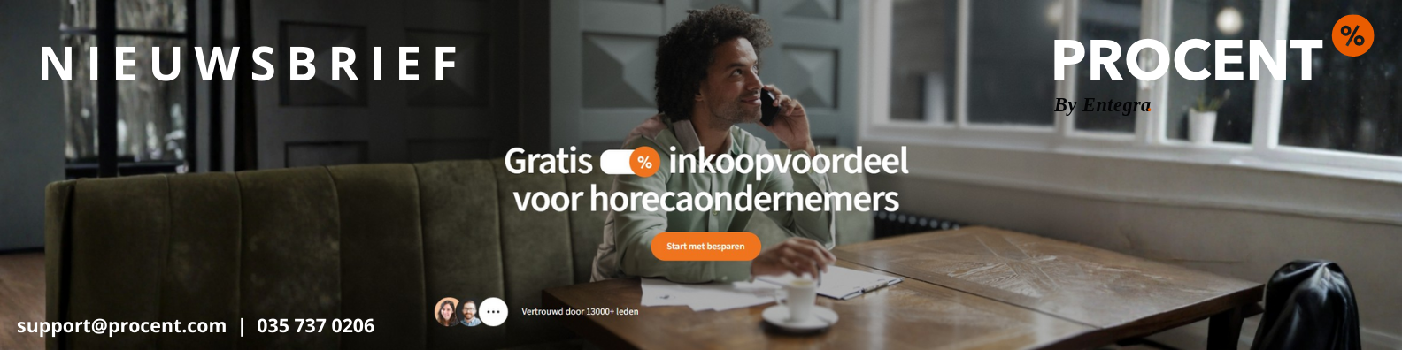 Divers leveranciers met kortingen (leveranciers: Nisbets en Supplierz). Procent by Entegra heeft betrouwbare partners voor de horeca in Nederland en België voor alle non-food gerelateerde producten. Zo is er online de keuze uit meer dan 60.000 producten, variërend van Torkrollen en servetten tot kaarsen enz. De besparing ten opzichte van groothandels ligt gemiddeld rond de 25%.