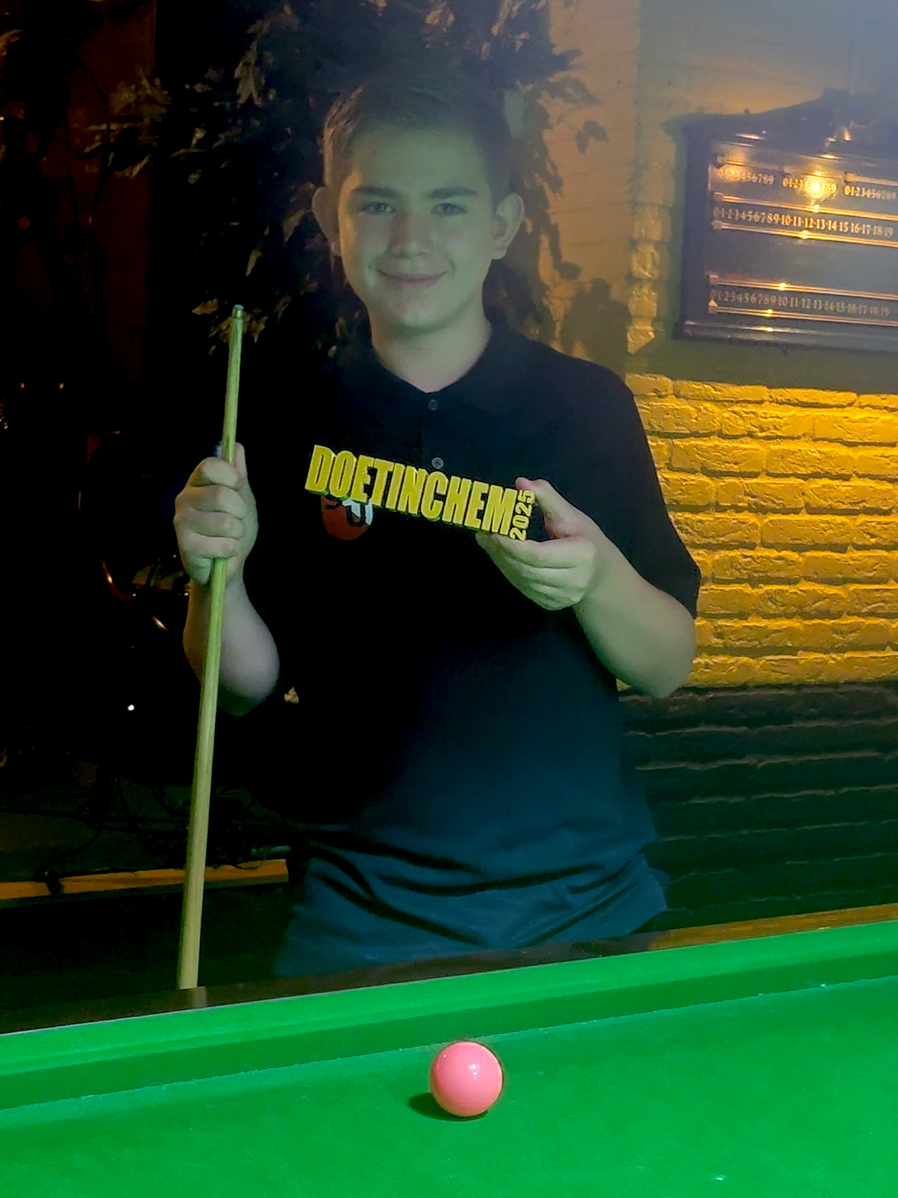DOETINCHEM - Op zondag 2 november reisden vijf jeugdspelers naar Doetinchem af—Tygo, Matthias, Bjarne, Julius en Kyran (voor wie het een thuiswedstrijd was). In The Snooker Society werden we warm ontvangen door Pieter en Pascal. Omdat we met een wat onhandig aantal van vijf deelnemers waren en de dag toch netjes wilden afronden, kozen we voor een Round Robin in best-of-2, vergelijkbaar met de Champions League. Aansluitend speelden de nummers één en twee om goud en zilver, en drie en vier om de bronzen trofee.