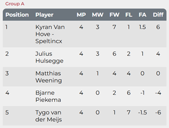 Eerder op de dag speelde Kyran ook sterk maar in Matthias (vice-Nederlands kampioen junioren) vond hij zijn gelijke, met de volgende scores: 51–55 en 51–48. Telkens leidde Matthias met grote cijfers maar wist Kyran de achtervolging goed in te zetten om het spannend te maken. Een fragment daarvan is hier terug te zien.