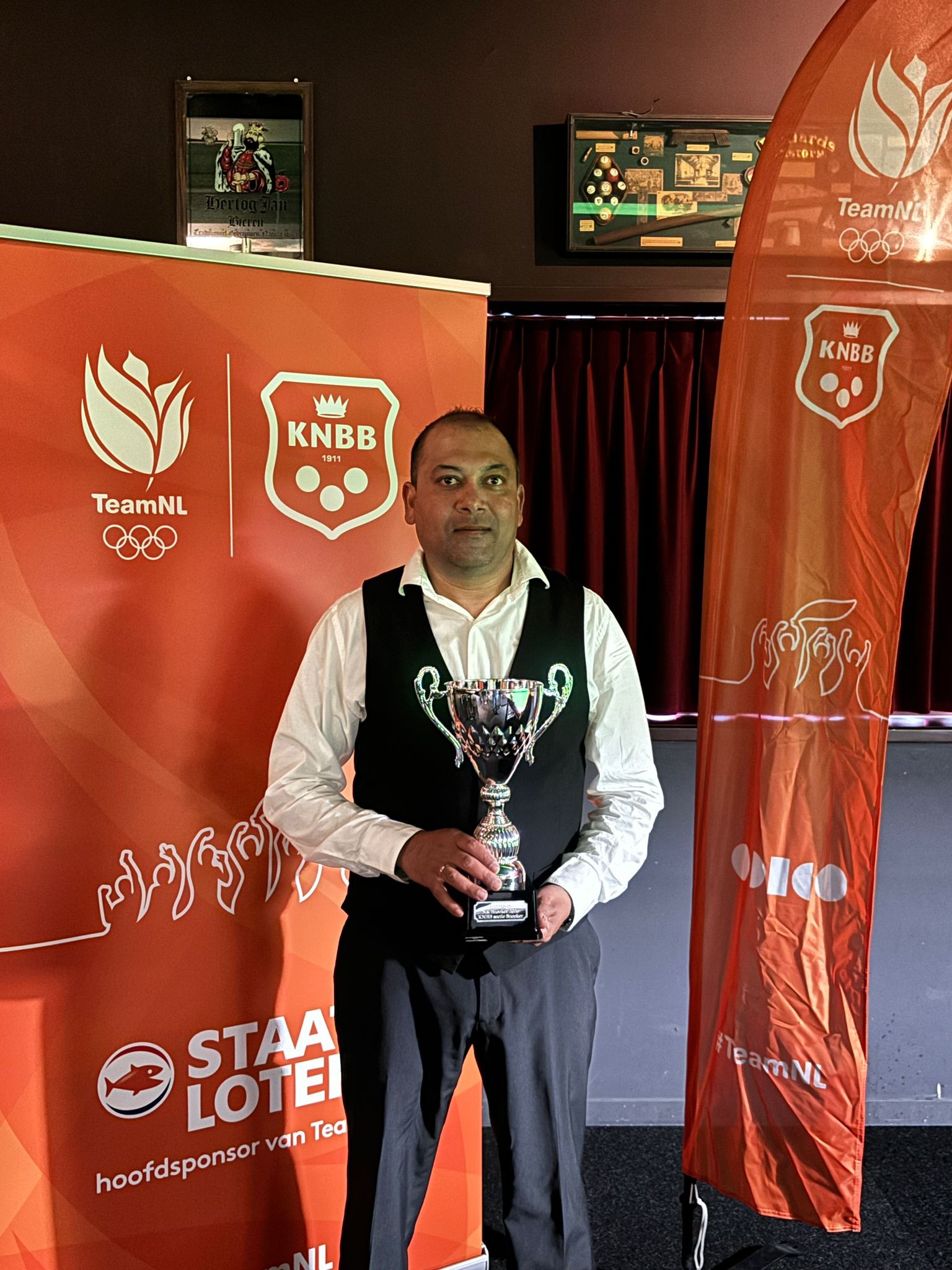 Ameer Baksh had na drie keer goud bij het NK koppels, diverse eredivisietitels en het NK Six-Reds graag zijn eerste NK-titel bij de heren veroverd. De man uit Hoogvliet, die knap van vijfvoudig kampioen Roy Stolk had gewonnen in de halve finale, was dan ook teleurgesteld. ,,Maar Hugo heeft heel goed gespeeld en verdiend gewonnen. Hij maakte zijn breaks netjes en legde zo veel druk op mij. Echt klasse van hem", feliciteerde hij zijn jonge rivaal. Om daar met een knipoog aan toe te voegen: ,,Ik ga zo wel zijn benen breken." Daarna vervolgde Baksh serieus: ,,Ik wil vooral mijn vrouw bedanken. Wat zij doet voor mij en ons gezin is onbetaalbaar en dat waardeer ik enorm. Ik hou van je schatje, en ik pak die beker volgend jaar wel", kondigde hij alvast strijdlustig aan.
