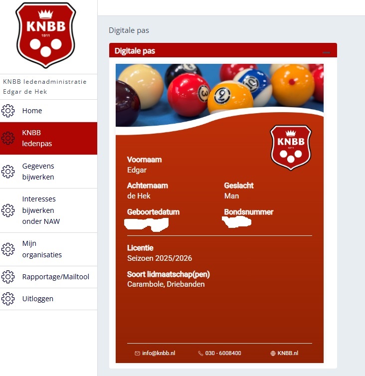 Deze ledenpas is voor ieder KNBB-lid gratis beschikbaar op https://www.mijnknbb.nl/. Als u bent ingelogd, ziet u dit: